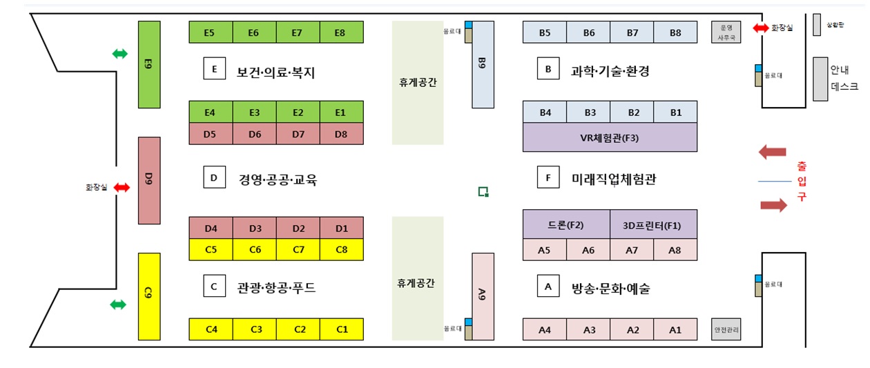 ■ 직업마을체험관: 전시관 1홀, 현장 신청 접수(직업인 멘토는 온라인 사전 신청) - 직업인 멘토 상담 온라인 신청 주소: https://hoy.kr/ZneQc - 신청 기간: 2019. 8. 26.(월) ~ 9. 3.(화) ■ 진로검사·상담관: 회의실 117호, 118호, 현장 신청 접수(상담 30분전 도착) - 개인진로검사: 프레디저 VR 적성 검사 - 진로상담: 초·중·고등학생별 보드게임을 통한 진로탐색 집단상담 진행 - 진로검사·상담 1회차(10:00 시작) 희망 학생은 09:30까지 회의실 117호에서 신청 ■ 학부모 진로교육 콘서트: 프리미어볼룸 A․B홀, 사전 온라인 신청 접수 - 1차: 2019.9.6.(금) 10:00~12:00, 문화예술시대의 진로교육, 강사: 장항준 감독 - 2차: 2019.9.7.(토) 10:00~12:00, 미래사회의 변화와 미래형 인재상, 패널 토크 - 3차: 2019.9.7.(토) 14:00~16:00, 행복해지는 인간관계에 대한 탐구, 강사: 김병후 ※ 학부모 진로교육 콘서트 온라인 신청 주소: https://bit.ly/2KzPVIK, 신청 기간: 2019.8.24.(토)~8.31.(토) |
