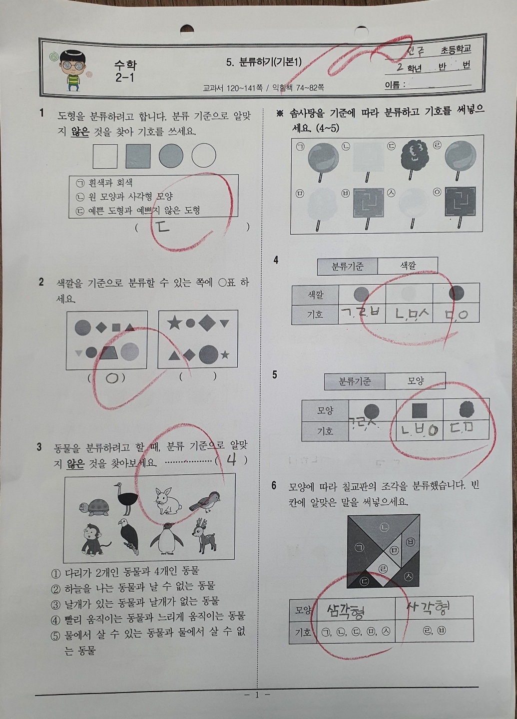 이번 2학년 5단원 수학 단원평가인 분류하기를 반에서 혼자 100점 맞았다고 합니다.