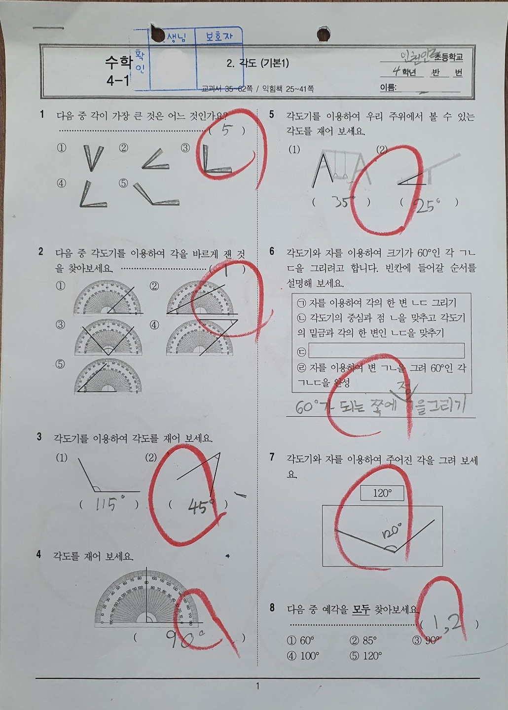 4학년 1학기 2단원은 각도로 예전에는 쉽게 넘어 갔지만, 요즘 학생들은 스스로 각도도 잘 못 재고 있는 현실입니다...
