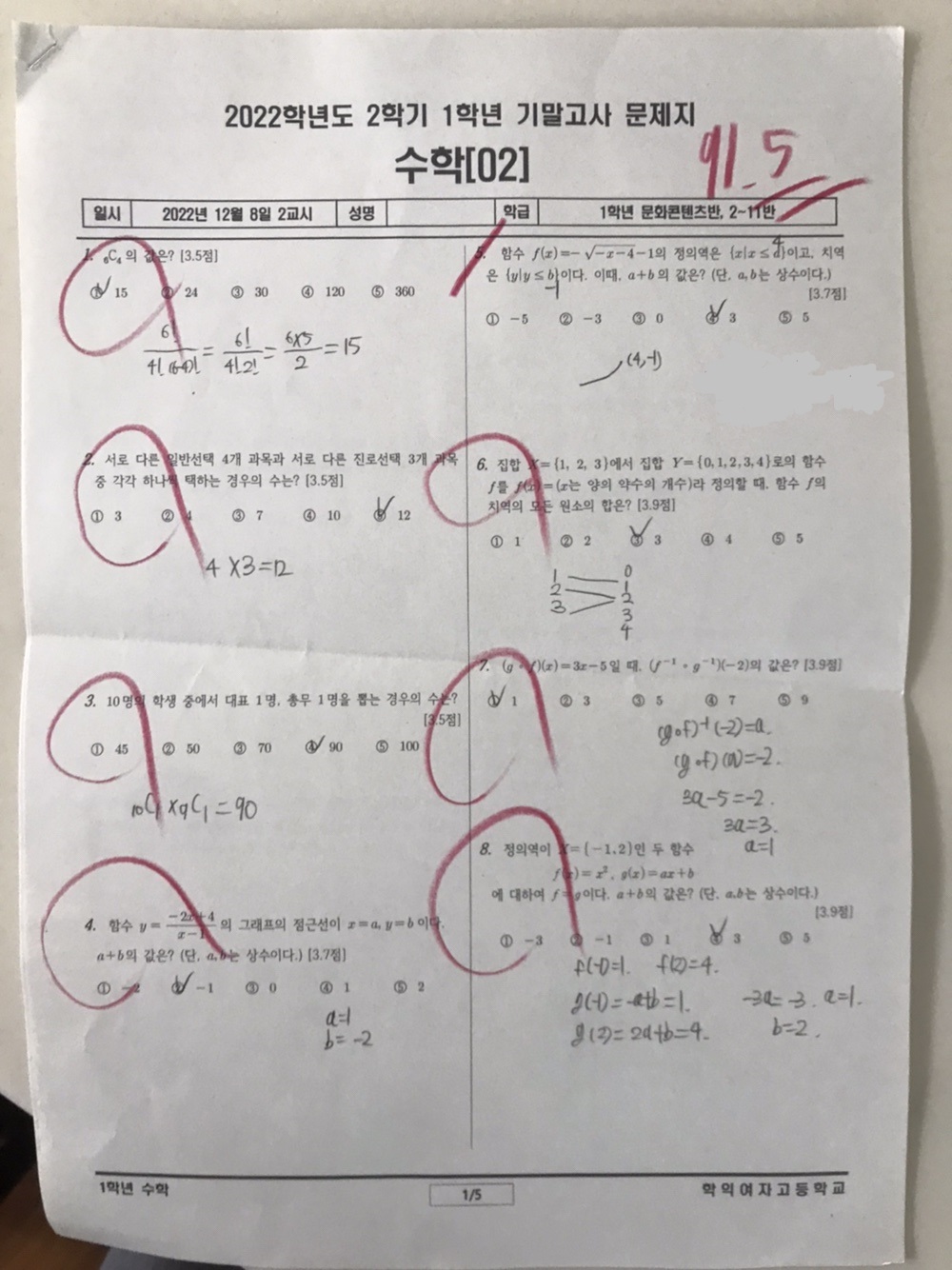 같이 공부하는 기간이 짧았지만, 끝까지 마무리를 잘 하여 이번에 2학기 1학년 수학 기말고사를 91.5점 맞았습니다~