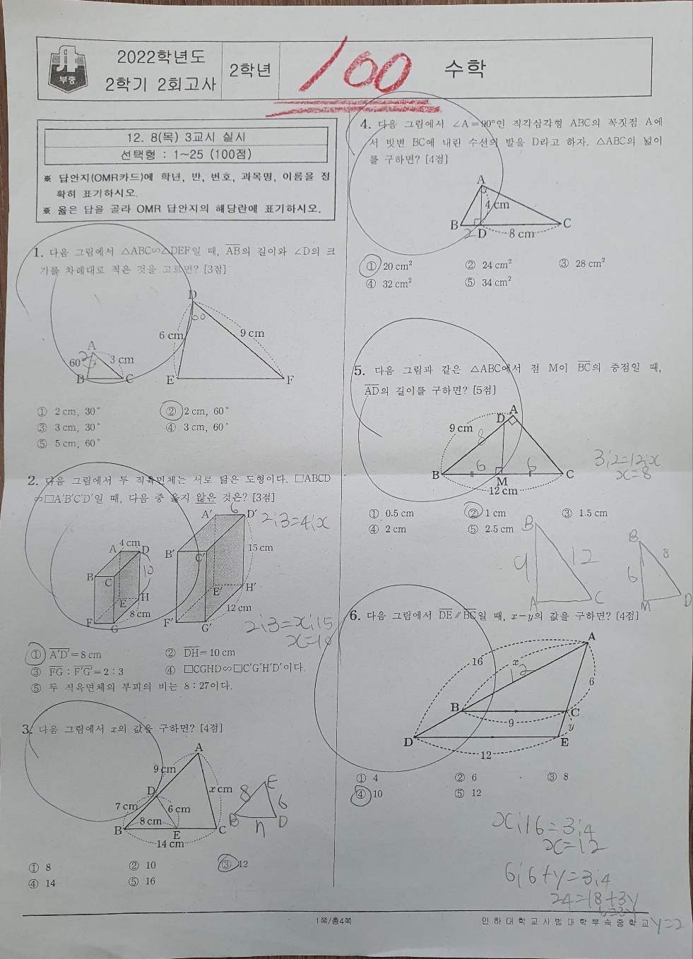 2022년 인하부중 2학년 2학기 수학 기말고사 문항 수는 객관식 25문항이었으며, 시험범위는 도형의 닮음에서 확률 끝까지였습니다~