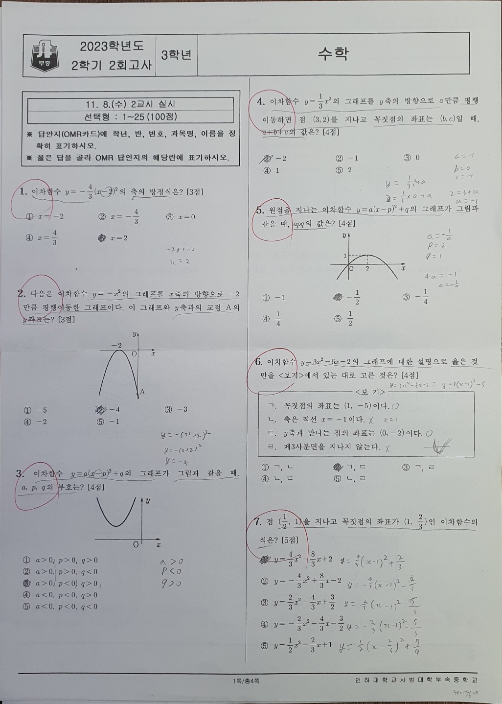 인하부중 2023년 3학년 2학기 기말고사 시험범위는 이차함수부터 원까지 였습니다~