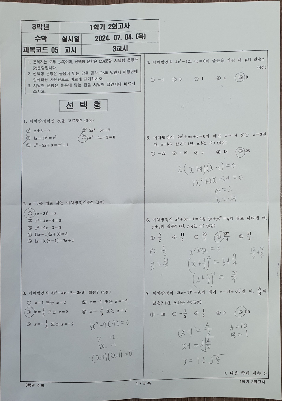 2024년 관교중학교 3학년 1학기 수학 기말고사는 객관식 23문항, 서답형 2문항, 총 25문항이었습니다.